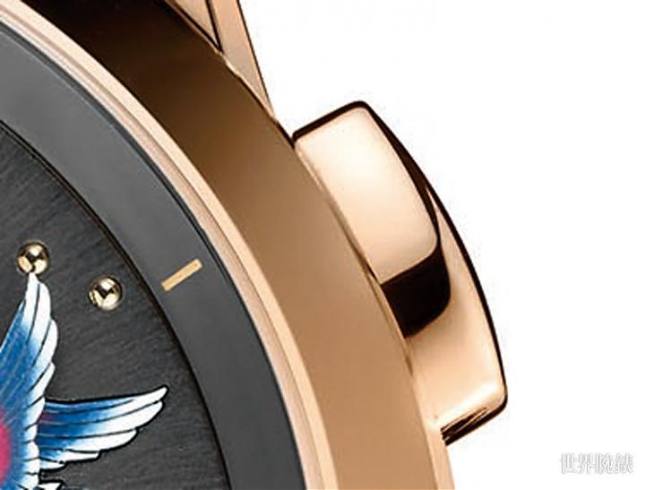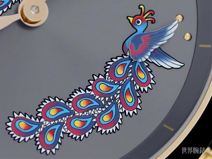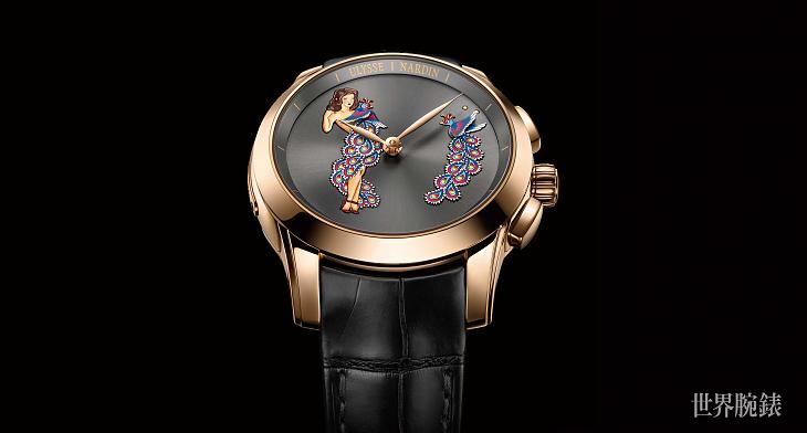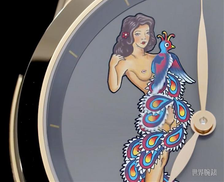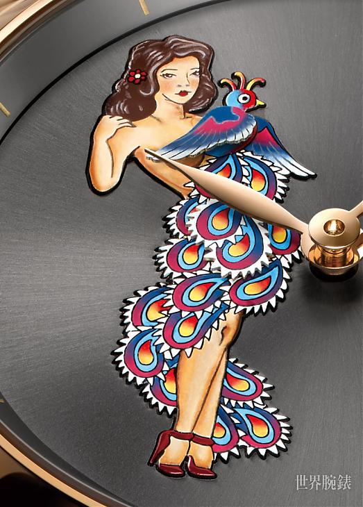 雅典自1989年推出備有動偶機械的四錘三問錶之後,活動人偶、問錶與音樂裝置成了品牌創作不可或缺的元素。而在2017年的日內瓦錶展上,雅典發表一款以舞孃和孔雀為主題的動偶自鳴單問錶,繼續以生動活潑的設計來吸引錶迷目光。黑色面盤上有兩個亮眼的微繪動偶,要將這樣精緻的圖案繪製在小巧的面盤上,需依賴有經驗的微繪師以精細的毛筆臨摹作畫,過程相當耗費時間。在左側栩栩如生的舞孃正是出自雅典微繪畫師細膩的畫筆,其細節上的琢磨更是令人嘆為觀止。而右側則繪上富有生命力的孔雀,其身上繽紛色彩的羽毛亦化作舞孃的衣裳,覆蓋著美豔舞孃若隱若現的性感曲線,兩者間相互輝映為錶款創造極佳視覺饗宴。