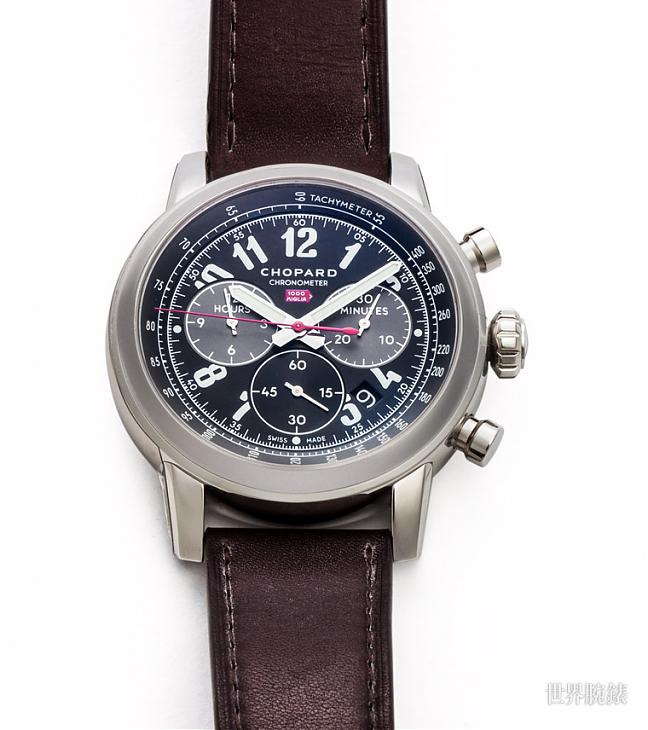 ▲"1000 Miglia"的紅色箭頭Logo是Mille Miglia的一大特徵,2014年式是將Logo放在3點的小秒盤內(那一代裝的是2894),這款則是將它移到了12點的品牌名稱下方。