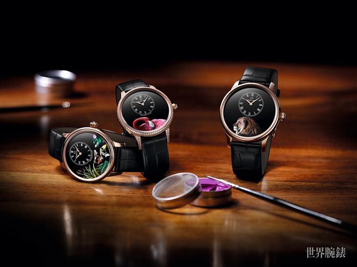 JAQUET DROZ雅克德羅藝術工坊近期推出繪有獅子、紅鶴及錦鯉圖案的偏心錶盤新作,通過黑色大明火琺瑯和生動的微繪工藝營造鮮明對比,昇華美感,讓腕上彷彿住著動物般活力盎然。