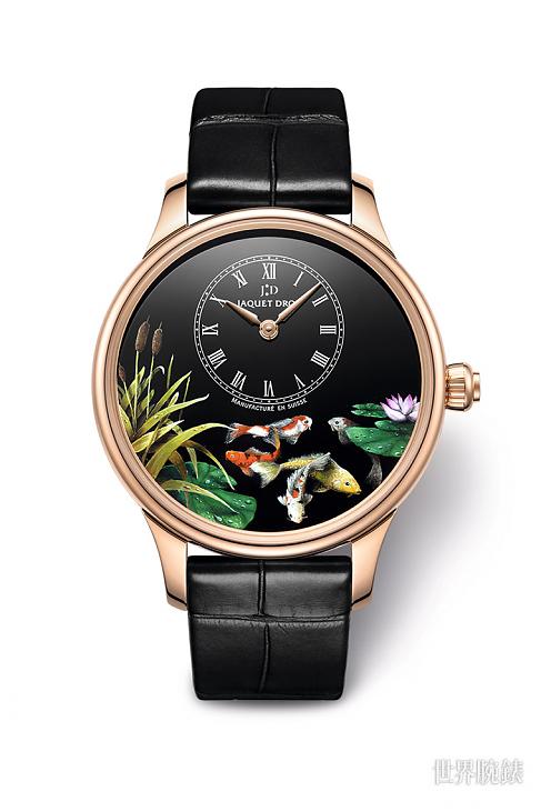 另一款同樣採用39毫米直徑的錶殼內,錦鯉在蘆葦和蓮花之間自在游弋。帶有多色魚鱗的錦鯉象徵長壽,傾情舞動著一闋水中芭蕾,散發優雅寧謐的氣質,在亞洲一直深受青睞。這款腕錶上的錦鯉亦代表著皮埃爾.雅克德羅所處的時代,即十八世紀時西方對遠東文化的執迷。而這些鐘錶作品曾是最早進入紫禁城的展品,實非偶然。