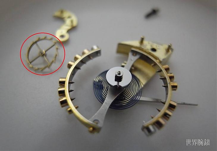 ▲擒縱叉的齒型很特別(紅線圈起處),這是衝擊式結構的獨特之處。