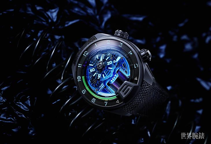 HYT將高級製錶技藝結合流體技術,推出一款配備光源的全新H4 Neo腕錶。HYT在面盤的6點鐘位置的拱狀結構下隱藏了兩個紫色LED燈,一旦啟動,它們便會照亮整個面盤。夜晚,在該光源的作用下,螢光有色液體和裝載螢光奈米粒子的透明複合面盤便充滿能量,變得格外驚豔。同時,燈光緩慢流入各個機械裝置的每一個角落和縫隙,令這一鏤空結構彷若煥發了生命。