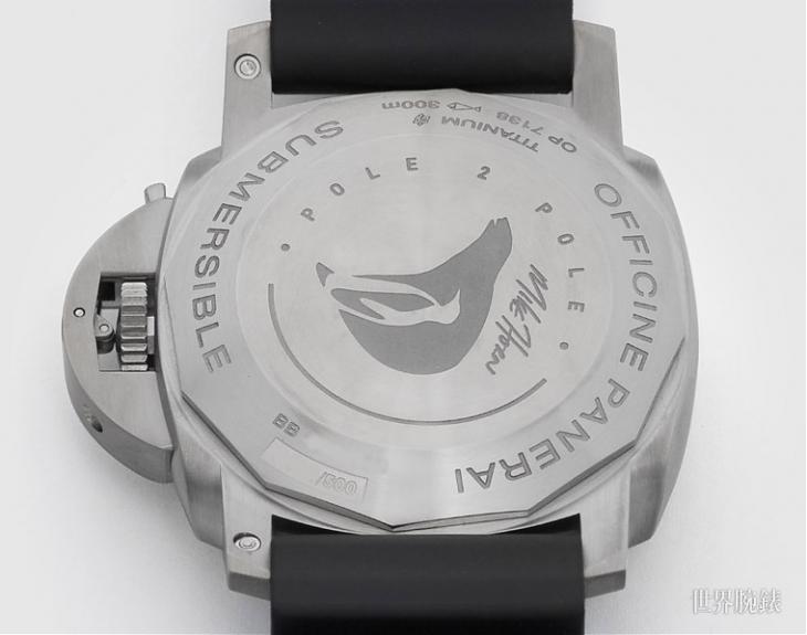 ▲考量到防水深度,Submersible原本就多採用實底蓋,而這款在底蓋上刻了Pole2Pole計畫的Logo,中央的圖案融合了分象徵兩極的企鵝和北極熊,相當可愛,上方則是Mike Horn的簽名。