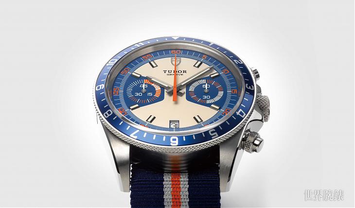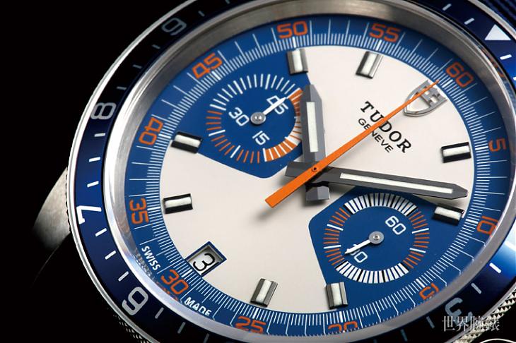 Heritage Chrono Blue在錶徑上由40mm調整成42mm,錶冠的坑紋處理比起原款的條紋設計更顯精緻,而且1973年原款當初所推出的錶圈有測量平均時速的Tachymeter性能,新款則強化計時功能顯時,並以雙面旋轉錶圈增加上手的便利性,並配備三重防水性能,更增添了錶款本身的實用性能,而6點鐘的日期窗,則取消了原款的放大設計,加以與面盤色彩相應的橘、灰、藍織紋錶帶,增添錶款的年輕氣息,相信更能擴大市場,吸引不少年輕玩家加入收藏TUDOR的行列。