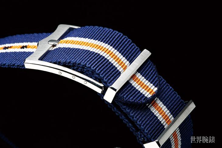 Heritage Chrono Blue附有兩款錶帶:一為摺扣不鏽鋼錶帶,另外則為強化織紋錶帶。織紋錶帶由與歷史悠久的傳統紡織工坊協助製成,其色調與表面標誌性的色彩巧妙呼應,確保佩戴舒適。錶帶所選用的藍、灰、橘3色,乃是與1973年所推出的Ref.7169/0經典面盤如出一轍,目前錶壇以藍色為基調的錶款都相當受歡迎,潮流新色加上錶款全新詮釋設計,相信藍、灰及橘色的鮮明色系,更能號召到大批年輕錶迷的支持。