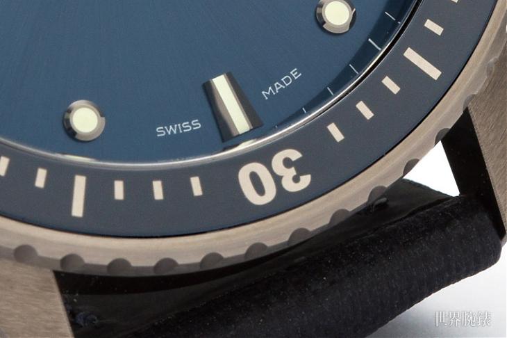 錶圈的部分也是;嚴格來說Bathyscaphe在外裝上的技術含量其實比本家五十噚來得繁複,五十噚的錶圈賣點幾乎都集中上面那層藍寶石水晶,相對地Bathyscaphe使用了陶瓷的色圈,而色圈裡的刻度和數字則用上了OMEGA的液態金屬技術,再加上這款的外圈又是等離子陶瓷,整只錶可以說是集Swatch Group外裝技術之大成了。