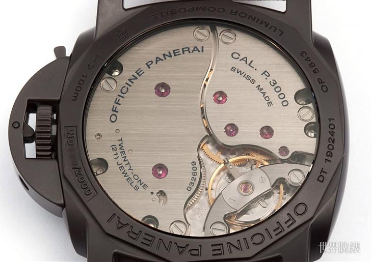 Panerai Composite材質/P. 3000/1手動上鍊機芯/時、分、小秒顯示/藍寶石水晶鏡面、旋入式透明底蓋/防水100米/限量2000只/參考價:NT$ 400,000