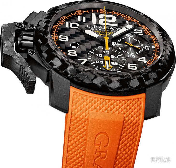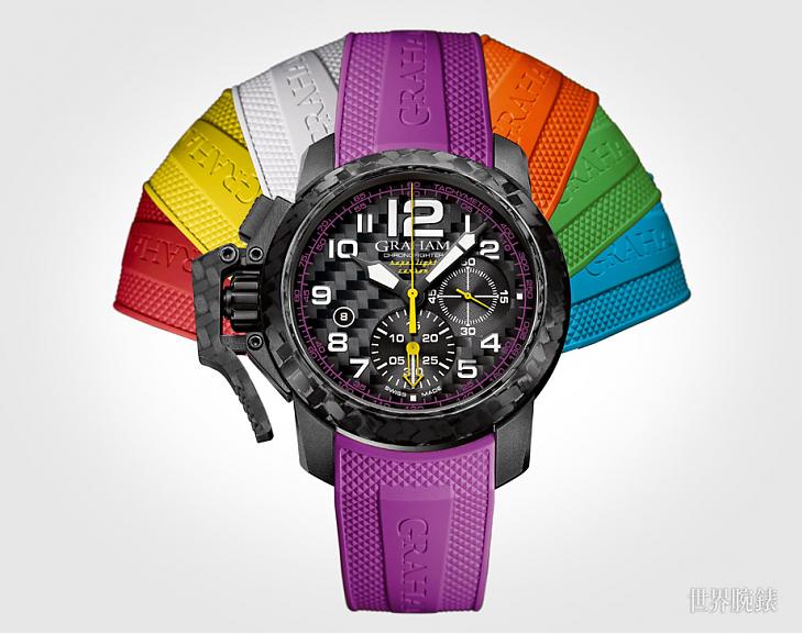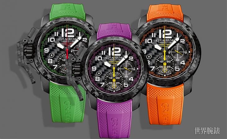 GRAHAM與賽車的淵源絕非表面功夫。自2009至2011持續贊助布朗GP一級方程式車隊(Brawn GP Formula One),接而贊助Swiss Porsche Cup、Isle of Man Tourist Trophy、Baja 1000、GT Asia系列、Spengler Cup Silverstone circuit 、Swiss Gurnigel Hill、Club Porsche Romand等賽事。將碳這當代賽車輕盈敏銳特質的關鍵,結合吸睛的輪胎色系,精確地反映出這些錶款完美結合外觀與機能的平衡美。而與輪胎有所不同之處是,錶帶的功能不受氣候影響,橡膠成份非常穩定。橙色代表期盼,綠色代表行動,紫色則可謂新世代的紅色,絕對自信滿滿。配上巴黎釘紋裝飾,這些大膽、時髦的造型就如賽車般萬眾矚目。
