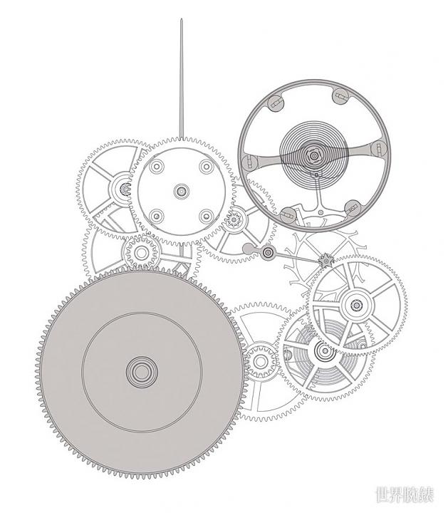 ▲機芯的跳秒系統是個從擒縱輪、撥針一路連到秒針輪之後連回發條盒,再順著二三四番車接上擒縱輪的封閉系統