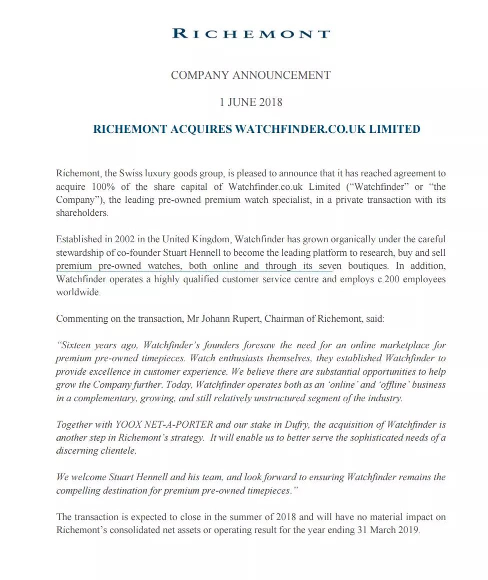 全球消費型態正面臨轉型,電商的崛起,讓全球知名奢侈品品牌陸續投入資源至當中,訴求轉變的產業還包括鐘錶界。全球鐘錶銷售走勢疲乏多年,各大鐘錶品牌皆在尋求突破,因此陸續傳來品牌顛覆過去鐘錶的經營方式,截至6月1日,江詩丹頓、朗格、卡地亞等諸多高端鐘錶品牌幕後的Richemont集團官方公告,宣布收購英國二手錶商Watchfinder全部股份,將其併入集團旗下。消息一出,也標誌著Richemont集團正式涉足二手錶業務。