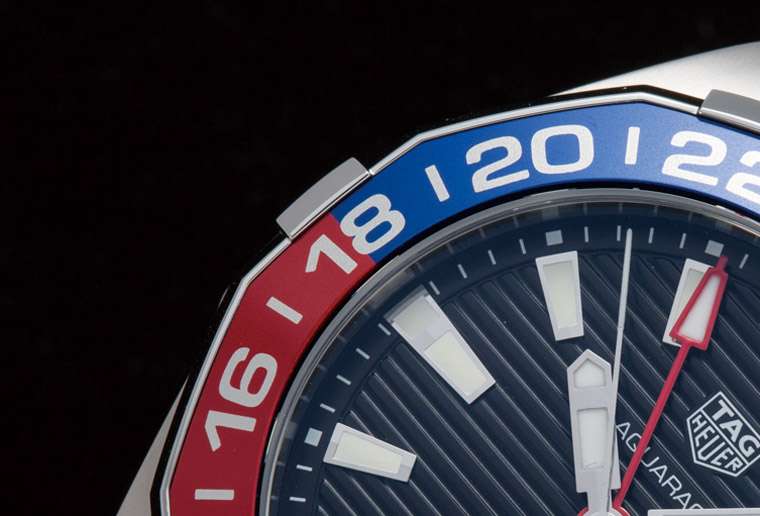 2017年TAG HEUER豪雅在Aquaracer這個系列上推出草綠、迷彩等幾款軍事風格強烈的新款,潮流掛的配色著實引起了不少討論,相對地同時推出的這款兩地時間款就屬於安全牌了,不過它醒目的紅藍百事圈同樣吸引到一些傳統玩家的注目。