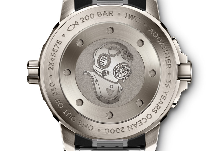 ▲底蓋上鐫刻了潛水員裝備突顯出Aquatimer系列與海洋文化的聯結意義,同時IWC打造出縝密的錶殼結構,也令腕錶防水性能達到罕有人及的2000米水準。