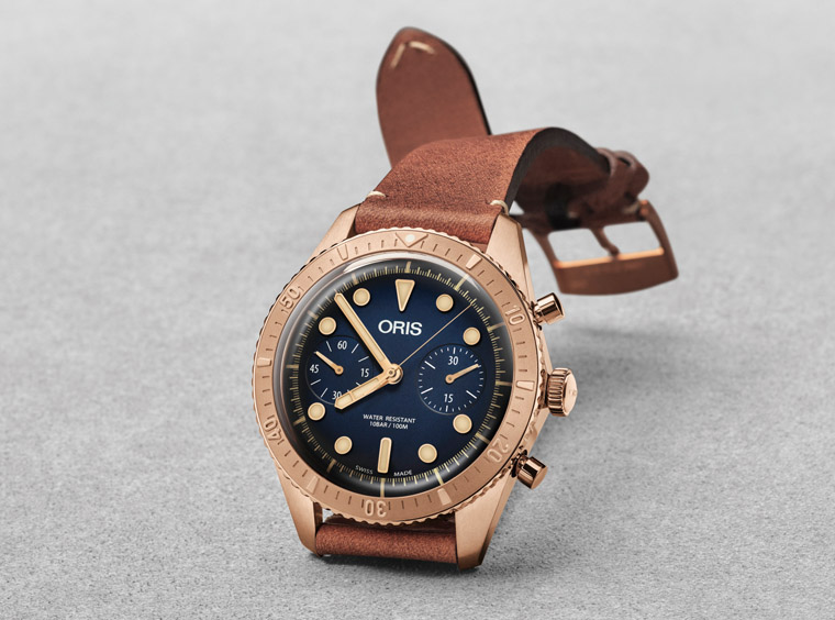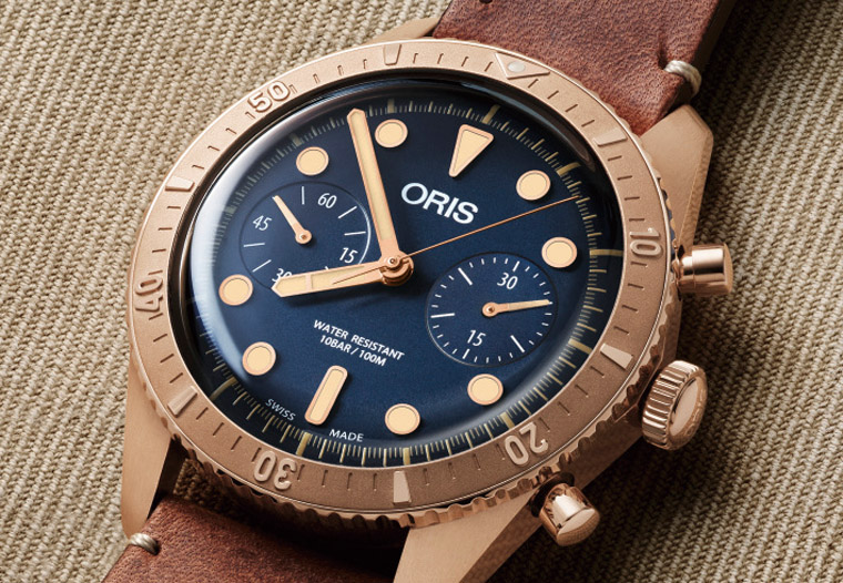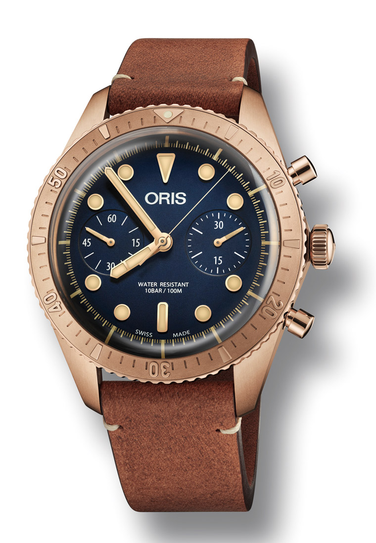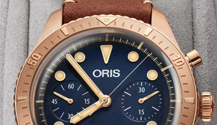 ORIS豪利時2018年發表的這款Carl Brashear限量計時碼錶是品牌的第二款銅殼錶,上一只是2016年的時候推出的三針款,同樣是以紀念美國海軍的傳奇潛水士官長Carl Brashear為名所發行的限量款式。2016年當時市面上已經有不少銅殼錶款了,ORIS在這個時候加入對消費者來說新鮮感已經不像早幾年那麼強烈了,不過他們家推出這款的另一個重要意義是將銅殼錶款的價位帶到了相對入門的階段,從這個角度來看對市場仍然很有意義。青銅錶殼以材料成本和成型加工而言並不是一項昂貴的技術,過去銅殼錶之所以會給人稀有的印象是因為有幾家強勢品牌推出了話題款式造成了洛陽紙貴的效應,但回歸到實際面它其實並不應該被這般炒作,ORIS的加入某種程度上也算是點破了這件事。