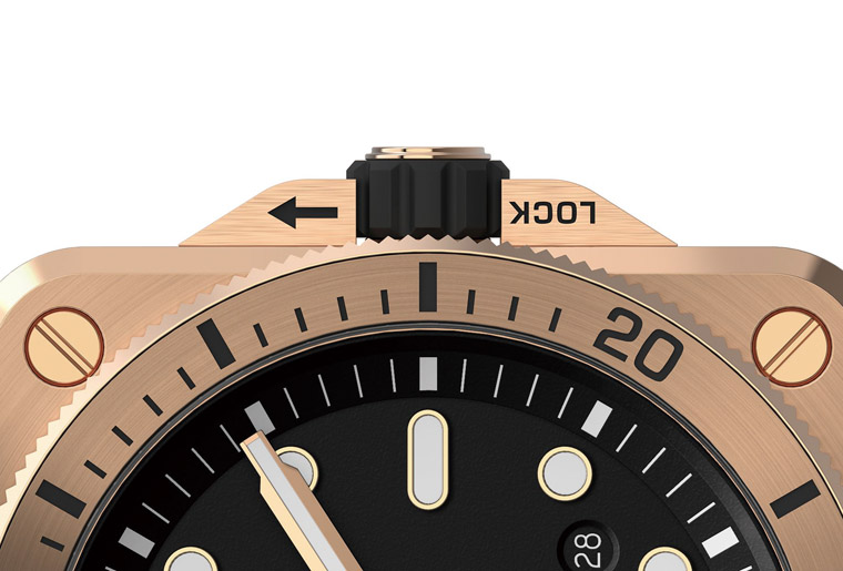 ▲錶冠外部覆有橡膠,方便戴著手套操作時可以止滑。錶冠護肩上標示有鎖緊錶冠的方向箭頭和字樣,像這類儀器風格的說明標示也是BR最吸引人的特色之一。