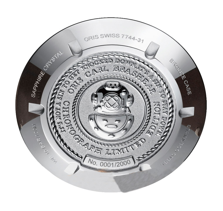 為了避免汗蝕底蓋另外採用了不鏽鋼材質,蓋身中央有浮雕的舊式潛水頭盔,外圈則是限量編號和Carl Brashear的名言「It’s not a sin to get knocked down. it’s a sin to stay down.(被打倒不是罪過,罪過是倒地不起。)」,以此呼應錶款的主題。
