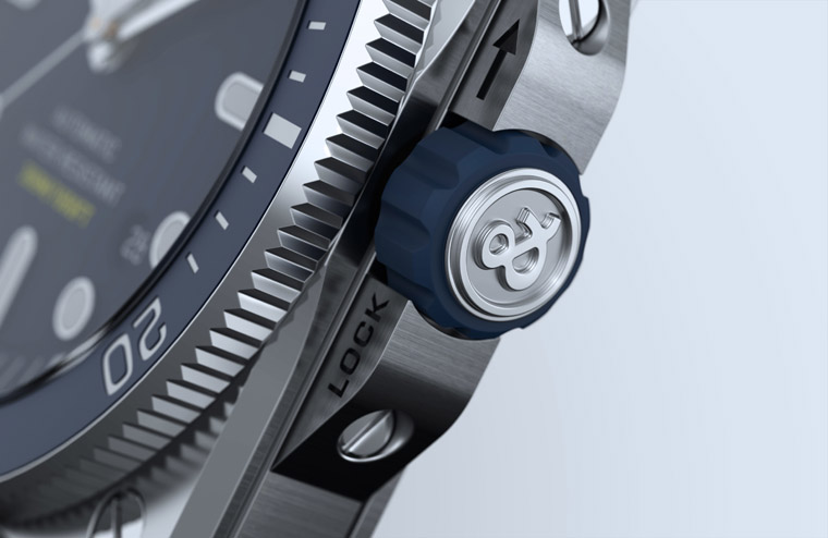 ▲旋入式錶冠的外層包覆了橡膠以方便操作。錶冠護橋也是潛水款特有的,過往的BR並不常見,護橋上的箭頭和"LOCK"字樣強化了BR最擅長的專業儀器風格。