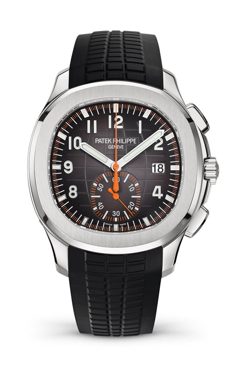 2018年百達翡麗針對運動錶家族似乎有了更多想法,例如金鷹系列破天荒進階高複雜功能推出萬年曆款式,將高級運動錶正裝化的趨勢推向新的高峰,回頭來看金鷹的兄弟——Aquanaut系列,雖然面世也有20年以上的時間,但是PP開發新功能款式的步調還是顯得比較保守,先前原本僅能粗略分為三針和兩地時間款式,不過考量到它做為入門款值得開發的潛力,於是2018年我們也意外但欣喜的發現品牌推出具備計時功能的新作Ref.5968A,一方面運動錶結合計時功能順理成章,同時也讓此系列終於有了前述兩種功能以外更多的選擇,而且從錶款的整體設計來看,顯然百達翡麗希望能切入年輕族群的市場,展現更活潑動感的朝氣。