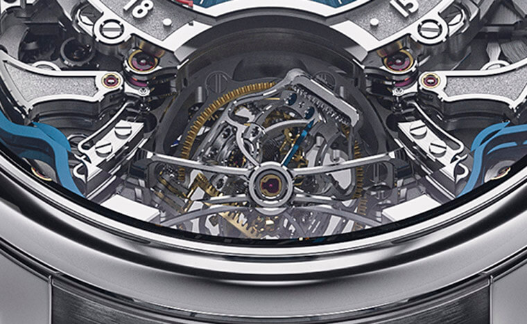 除了陀飛輪以外,Master Grande Tradition萬年曆球體陀飛輪三問也同步具備了一分鐘恆定動力系統,它能對陀飛輪穩定輸出動力,還可以調節分鐘輪的速度,就連三問裝置也受到恆定動力系統的正面影響,因為控制報分系統的機制也與恆定動力的一分鐘瞬跳設計相連,所以錶款也不會出現報時樂音與實際顯時產生約一分鐘的落差,讓人耳朵聽的和眼睛看的時間可以保持一致。