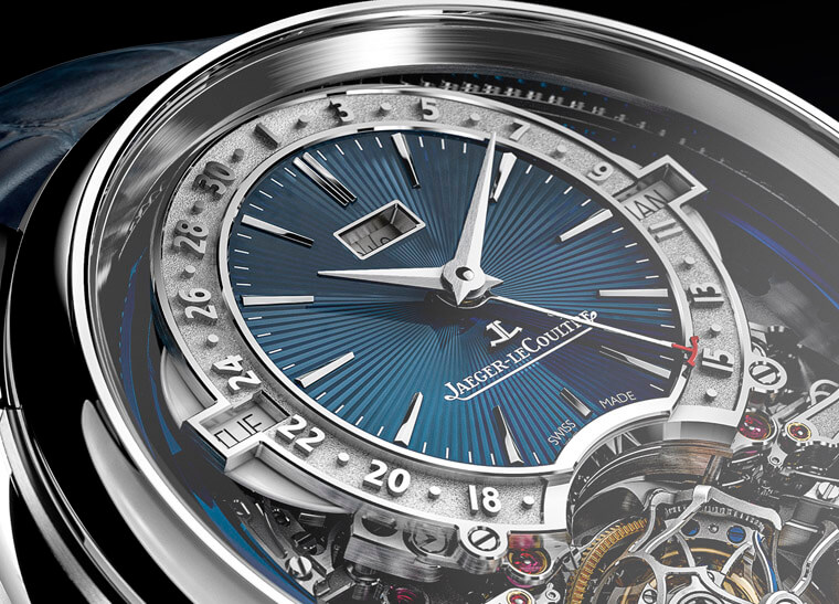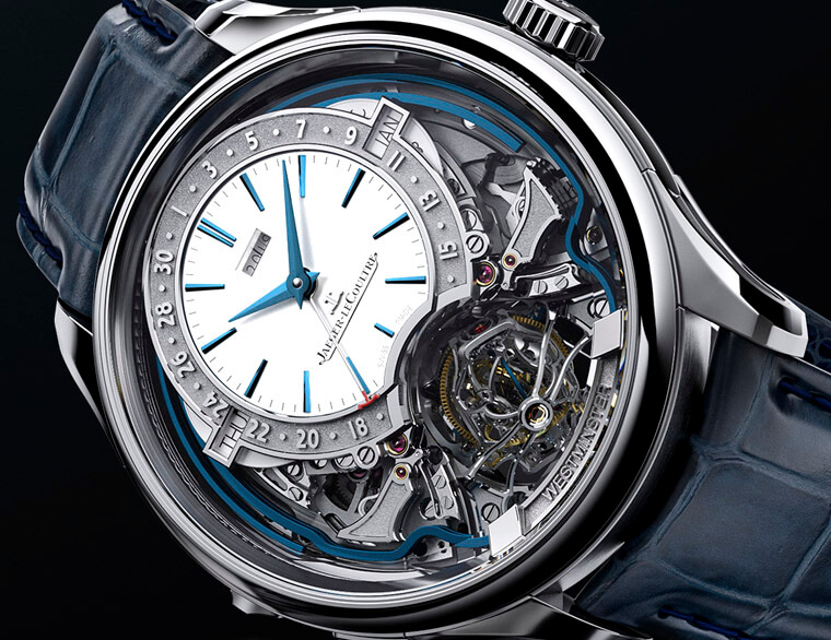 Master Grande Tradition萬年曆球體陀飛輪三問以白金材質製作錶殼,43mm的尺寸以這種複雜功能等級來說相對大小適中,戴在手上不會感到過於沉重。錶款的面盤採用開面設計,露出包括三問系統在內的重要機芯零件,而它的顯時資訊主要集中在面盤上半部,偏心錶盤分別採用機刻、細工捶打與大明火琺瑯等多重裝飾工藝加以點綴,積家一共推出藍色大明火琺瑯錶盤和銀白色粒紋錶盤兩種款式,前者搭配銀白色指針,後者則是採用藍鋼指針,看時間因此更直覺易懂。