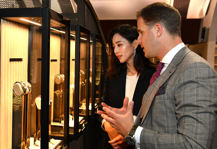 ▲張鈞甯在IWC CEO Christoph Grainger-Herr介紹下,欣賞品牌2019年所推出的最新錶作。