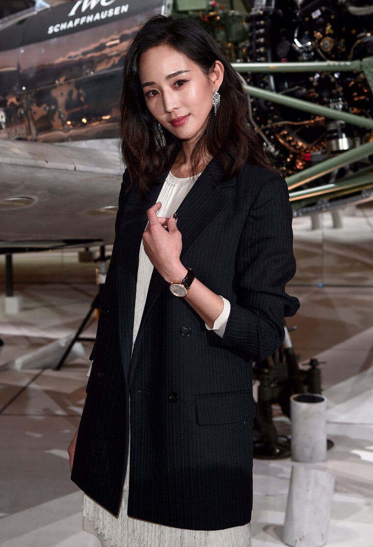 ▲張鈞甯2019年參觀IWC S.I.H.H.錶展展場時,身著白色洋裝搭配深色西裝外套,手上佩戴的則是柏濤菲諾月相自動腕錶37紅金款。