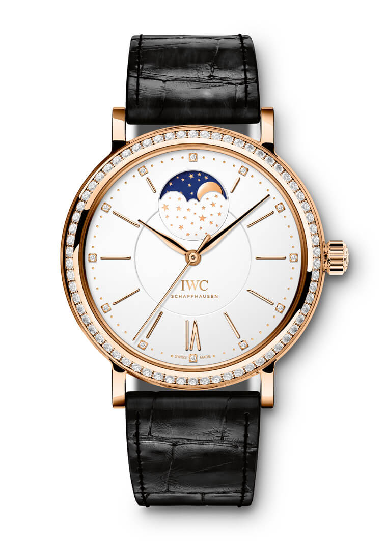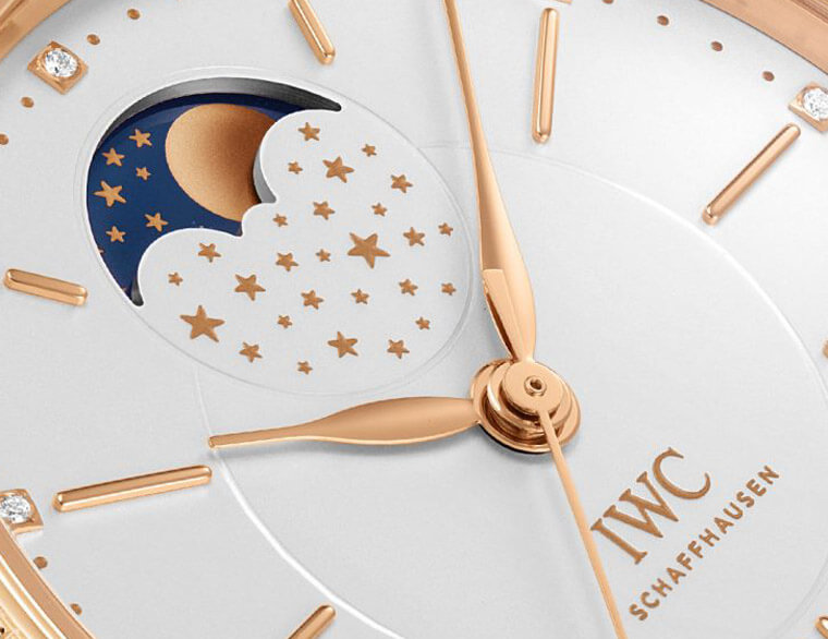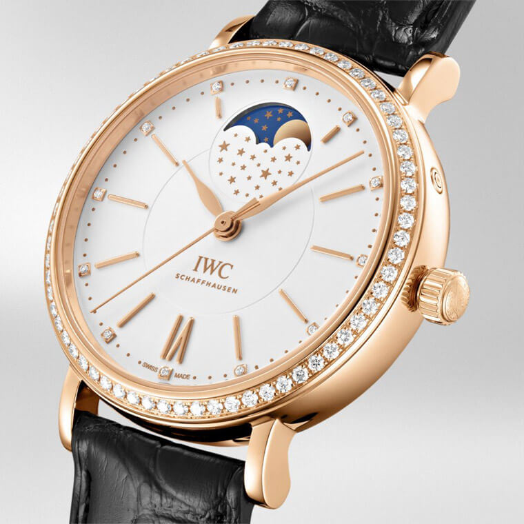 柏濤菲諾月相自動腕錶37紅金款為該系列中型的尺寸,如此大小令女性佩戴起來絲毫不覺突兀,除了高貴的貴金屬錶殼,這款錶在外觀上的亮點尚包括錶圈鑲上多達66顆美鑽,勾勒出圓形錶殼的唯美弧線,目光移至面盤,可見盤緣與12個時標對應之處也鑲嵌了12顆鑽石,而面盤一切顯時的零件包括柳葉指針與線型時標的共同特徵就是纖細修長,面盤不僅採用內外雙圈的層次感設計,外圈具備的陽光飾紋則是讓白色面盤在光線照射下得以輝映出更耀眼動感的視覺效果。錶款的月相顯示位於面盤12點方向(及俗稱的當頭月),很自然能吸引目光注意,IWC特地在扇形月相窗下方的遮罩上點綴了數十顆金質星星,彷彿是下方月相轉盤星星與月亮圖案的延伸,看起來浪漫而富有詩意。