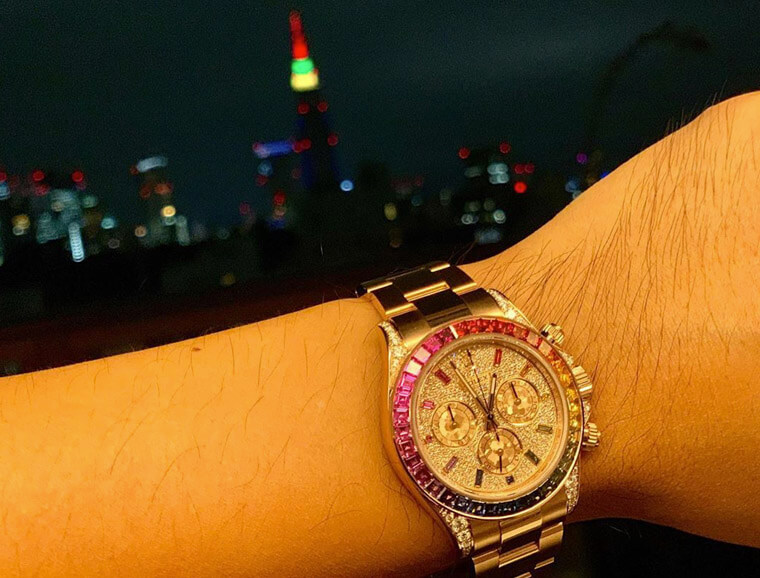 結果那則貼文Po出後幾天,周董再發了一張戴錶照,之前那張疑似不是帝舵的照片終於浮現解答,原來他戴的是2018年勞力士推出的玫瑰金Daytona 116595RBOW。既然是同集團的手錶那就比較沒有爭議了,但從中也可以發現周董私底下似乎更偏向佩戴(華麗的)運動錶款式。116595RBOW原本就在錶耳鑲鑽,並且在錶圈與時標上鑲嵌七色寶色,整體設計比起7年起推出的黃金款Daytona彩虹圈略有差別,新款上市後非常受到市場喜愛,之前我們也看過湖人隊球星Anthony Davis佩戴116595RBOW,然而周董曬的玫瑰金彩虹圈Daytona又還比Davis戴的更凶,因為周董那款是連面盤都鑲滿了鑽石,而非較常看到的黑面版本,也由於這些鑽石的關係,因此先前周董和小周周合照時才會被認為戴了一只淺色面盤的錶,那其實是鑽石的白色光芒。